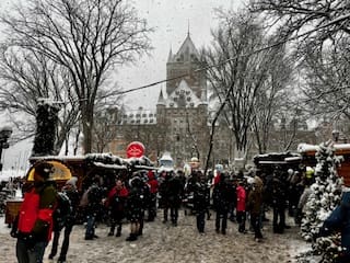 The next morning, we travelled by coach to Quebec City, stopping enroute at a delightful coffee and gift shop. Beautifully curated local items to purchase as well as tasty treats to enjoy with coffee. We arrived in a snowy, storybook-perfect Quebec City. Big soft flakes drifted down as we wandered through the Christmas markets and charming ,quaint streets of Old Quebec. Christmas music floated through the air, happy vendors greeted us, and unique handicrafts made for delightful browsing. It was, as Alison put it, “magical and really put us in the Christmas spirit.”