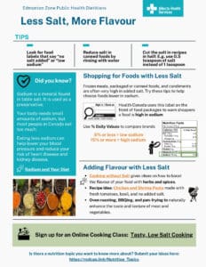 Did you know that sodium is a mineral found in table salt? It is also used as a preservative. Eating less sodium can help lower your blood pressure and reduce your risk of heart disease and kidney disease. Alberta Health Services also has low salt cooking classes available to provide meal ideas and explore ways to reduce salt intake by using delicious, lower salt substitutes and label reading.