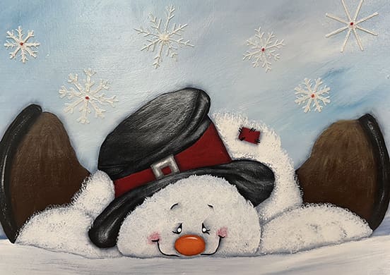 - Paint this adorable snowman who’s taken a cheerful tumble into the snow.