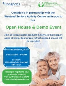 Join us for a Free Open House & Demo Event with Congdon’s Aids to Daily Living on Tuesday, October 21 at 1:30 p.m. at 10550 Mayfield Road NW, Edmonton.