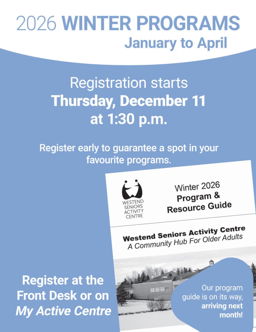 Register in-person at the WSAC Gym, or online through My Active Centre (class links for online registration available on WSAC Website) both starting at 1:30 p.m. on Thursday, December 11, 2025.