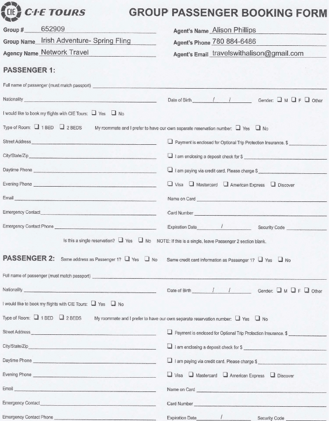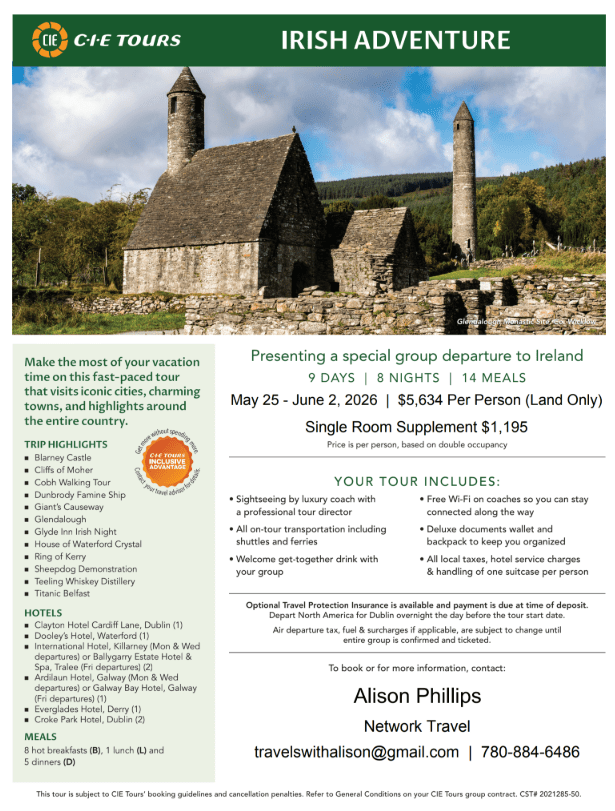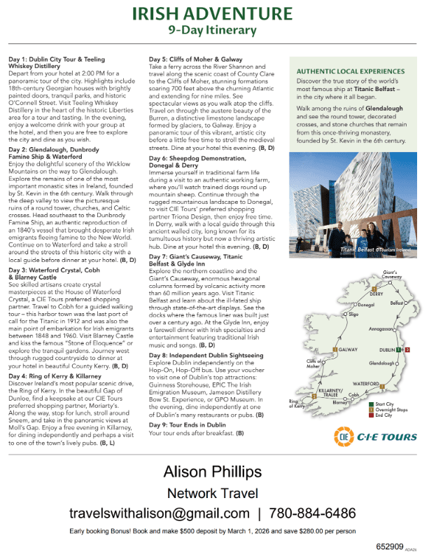 Optional Travel Protection Insurance is available. Payment is due at time of deposit. Departure from North America is overnight to Dublin, the day before the tour begins.